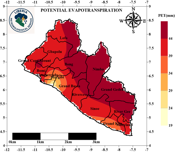 PET: During the second Dekad of March 2026, most parts of the Country experienced intense sunshine with high evapotranspiration rates. However, the coastal region experienced low evapotranspiration rate with Margibi, Grand Bassa and Grand Kru experiencing the lowest. Nevertheless, the northern part of the country experienced high evapotranspiration rate