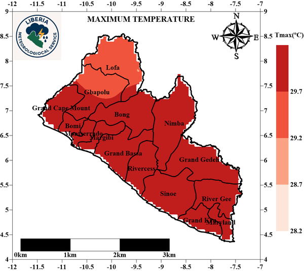Maximum Temperature: The maximum temperature in March 2026 is anticipated to be between 28.6°C to 32.7°C across the counties. The lowest maximum daytime temperatures are predicted over Maryland, Grand Kru, Sinoe, Margibi and Grand Bassa counties. The highest maximum temperature is expected in the north, west and central regions of the country. However, the extreme maximum temperature is expected to occur in parts of Lofa, Nimba, Gbapolu and Grand Cape Mount counties.