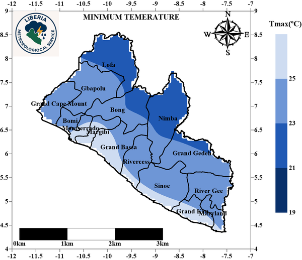 Minimum temperature: Minimum temperature across the country in March 2026 is anticipated to range between 23.0°C and 26.8°C. The highest minimum temperature is anticipated to occur along the coastal region affecting counties such as Maryland, Grand Kru, Sinoe, Rivercess, Grand Bassa, Margibi and Montserrado while the lowest minimum temperature is expected in Lofa and parts of Nimba, Bong and Gbapolu counties.