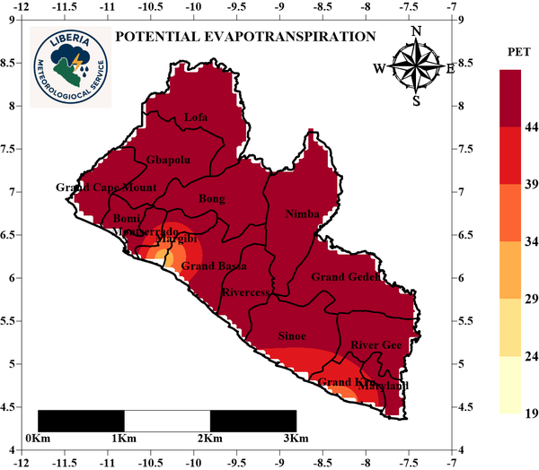 PET: During the third Dekad of March 2026, most parts of the Country experienced intense sunshine with high evapotranspiration rates. However, parts Margibi, Grand Bassa, Sinoe and Grand Kru experienced the lowest evapotranspiration rate. Nevertheless, the rest of the country experienced high evapotranspiration rate.
