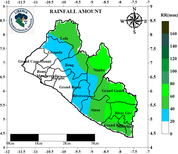 RAINFALL: In APRIL 2026, the forecasted cumulative rainfall amount across the counties is anticipated to be between 133.0mm and 231.3mm. Sinoe, River Gee, Grand Kru, Maryland and parts of Nimba, Rivercess, Grand Bassa, Nimba, Lofa and Gbapolu are expected to record the highest rainfall amount. The western region including Grand Cape Mount, Bomi, Montserrado, Margibi and parts of Grand Bassa and Gbarpolu are expected to receive less rainfall during this period. The rest of the country are expected to experience moderate rainfall during this period.