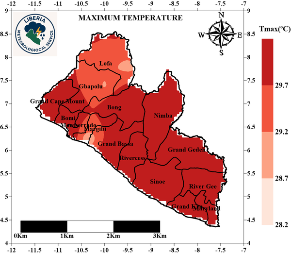 Maximum Temperature: The third Dekad of March 2026 was marked by an increase in maximum temperature in most parts of the country with Lofa and parts of Gbapolu and Margibi counties experiencing the lowest. During this period maximum temperature ranged between 29.1°C and 31.2°C.