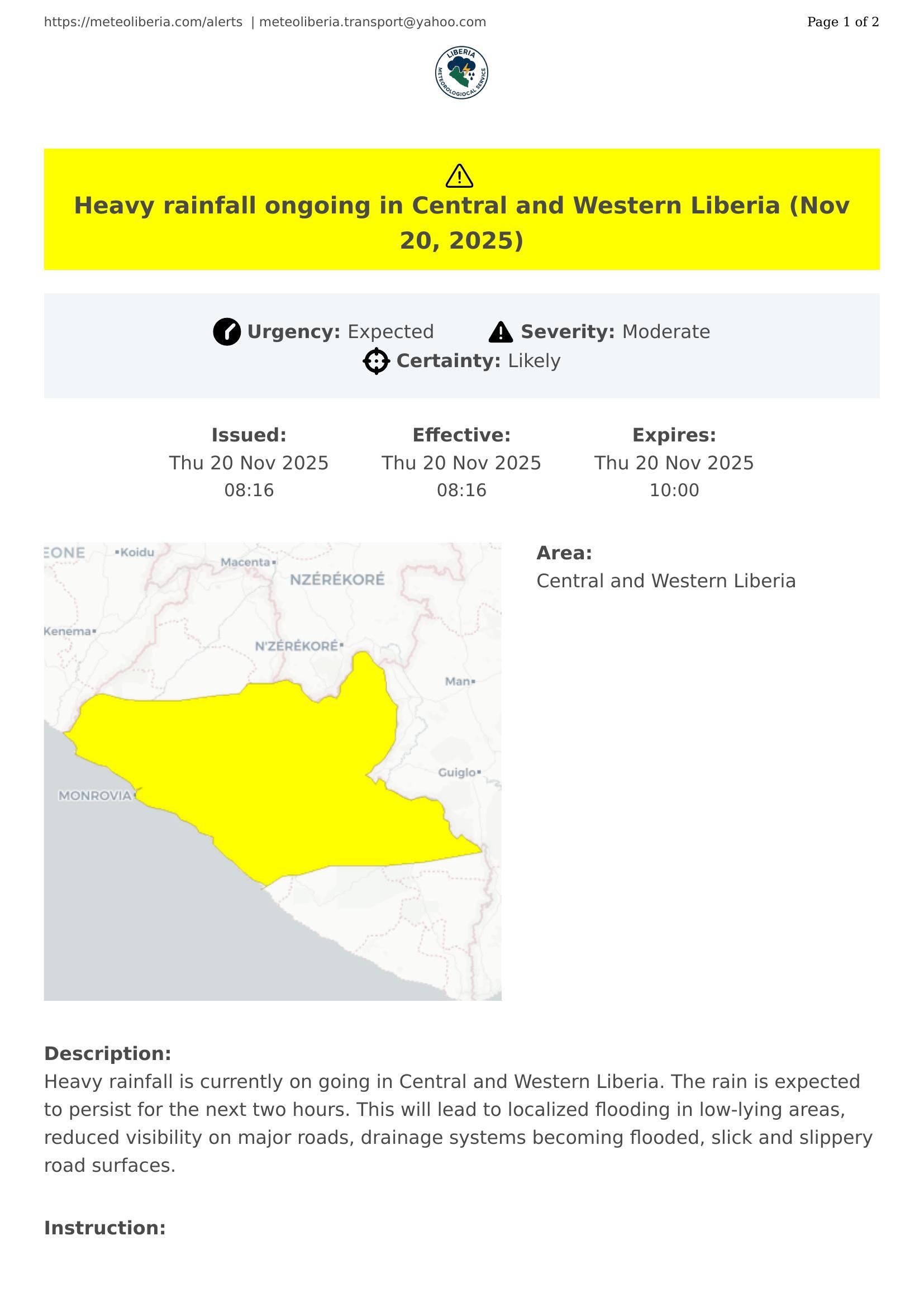 Heavy rainfall is currently on going in Central and Western Liberia. The rain is expected to persist for the next two hours. This will lead to localized flooding in low-lying areas, reduced visibility on major roads, drainage systems becoming flooded, slick and slippery road surfaces.