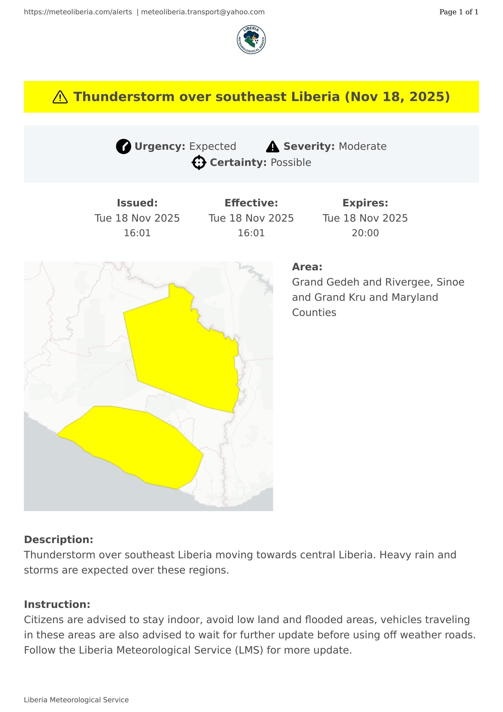 Citizens are advised to stay indoor, avoid low land and flooded areas, vehicles traveling in these areas are also advised to wait for further update before using off weather roads. Follow the Liberia Meteorological Service (LMS) for more update.