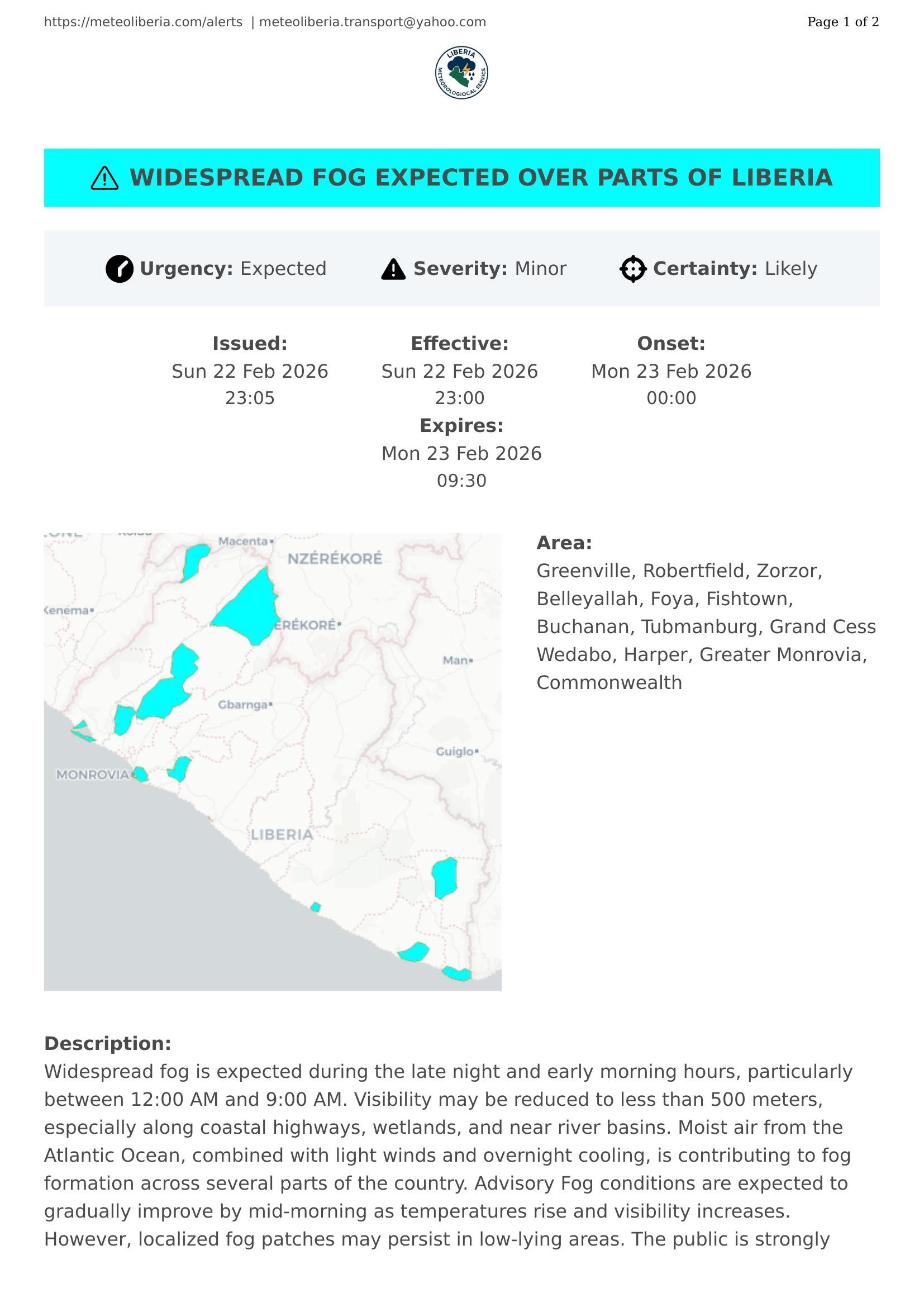 Widespread fog is expected during the late night and early morning hours, particularly between 12:00 AM and 9:00 AM. Visibility may be reduced to less than 500 meters, especially along coastal highways, wetlands, and near river basins. Moist air from the Atlantic Ocean, combined with light winds and overnight cooling, is contributing to fog formation across several parts of the country. Advisory Fog conditions are expected to gradually improve by mid-morning as temperatures rise and visibility increases. However, localized fog patches may persist in low-lying areas. The public is strongly advised to remain cautious and follow safety guidelines. The National Meteorological Service will continue monitoring conditions and provide updates as necessary. For further information, contact the National Meteorological Service or tune in to local radio announcements.