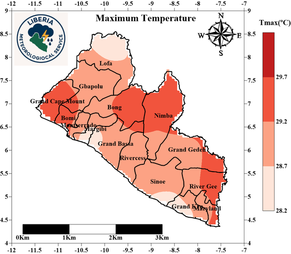 Maximum Temperature: The first DEKAD of January 2026 was marked by a moderate increase in maximum temperatures in Grand Cape Mount, Bomi and parts of Gbapolu, Bong, Nimba, Grand Gedeh and River Gee while parts of Margibi, Bassa, Sinoe and Grand Kru recorded the lowest. During this period maximum temperatures ranged between 28.6°C and 29.7°C