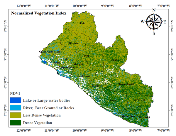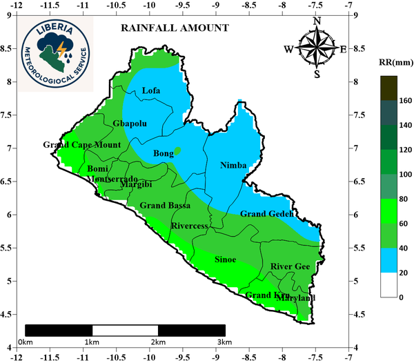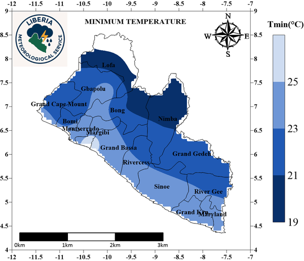 During the second dekad of December 2025, southern Liberia experienced moderate rainfall, while northern and parts of central regions recorded low rainfall. Nationwide rainfall amounts ranged from 25.1 mm to 75.1 mm. Maximum temperatures increased across several southern and central counties, ranging between 26.9°C and 29.2°C, while minimum temperatures varied from 18.2°C to 25.1°C, with warmer conditions along the coast and cooler conditions in the north and northwest. High evapotranspiration was observed in the north and northwest, moderate levels in central and western areas, and low levels along the coast. Dense vegetation covered the southeast, whereas the southern region showed relatively less dense vegetation.