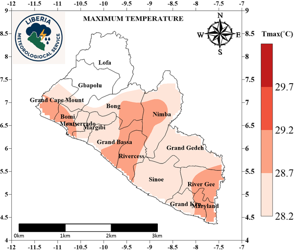 Forecast for December 2025: Cumulative rainfall is expected to range from 25.3 mm to 119.4 mm, with higher amounts (60–110 mm) over the southeast coastal counties and less than 60 mm in the northern counties. Relative humidity is predicted to range from 69% to 83%, highest in the southern counties. Maximum temperatures are anticipated to range from 28.6°C to 32.1°C, while nighttime temperatures may range between 17.4°C and 25.9°C, with the coolest conditions in northern counties.