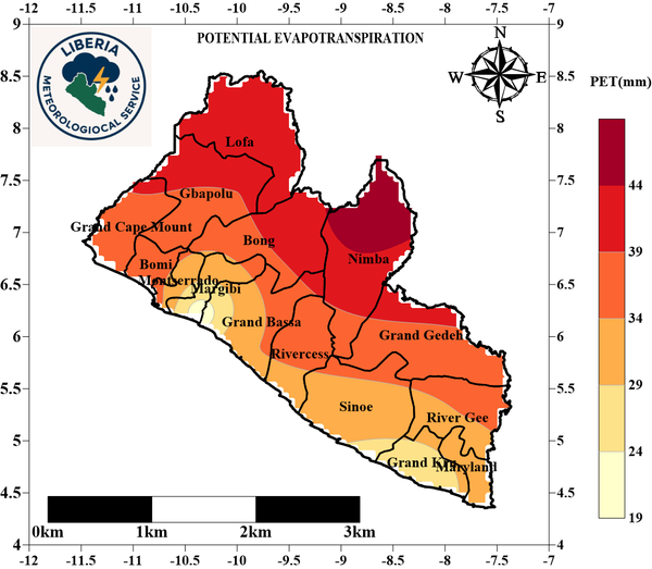PET: During the third Dekad of February 2026, most parts of the Country experienced intense sunshine with high evapotranspiration rates. However, the coastal region experienced low evapotranspiration rate with Margibi, Grand Bassa and Grand Kru experiencing the lowest.