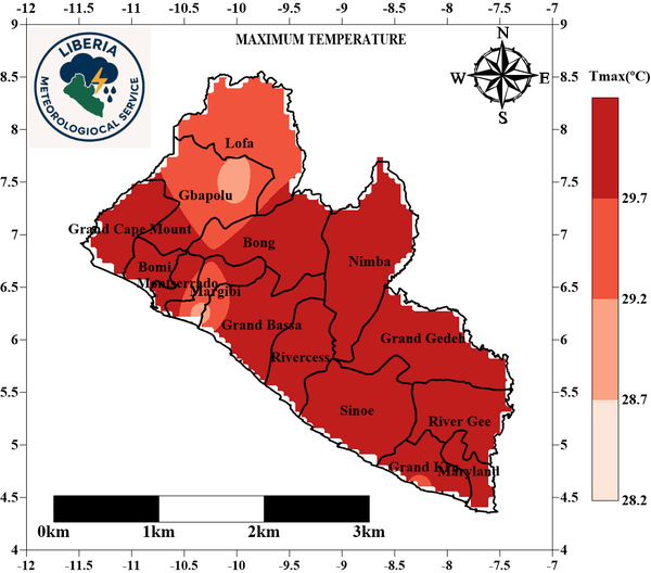Maximum Temperature: The maximum temperature in March 2026 is anticipated to be between 28.6°C to 32.7°C across the counties. The lowest maximum daytime temperatures are predicted over Maryland, Grand Kru, Sinoe, Margibi and Grand Bassa counties. The highest maximum temperature is expected in the north, west and central regions of the country. However, the extreme maximum temperature is expected to occur in parts of Lofa, Nimba, Gbapolu and Grand Cape Mount counties.