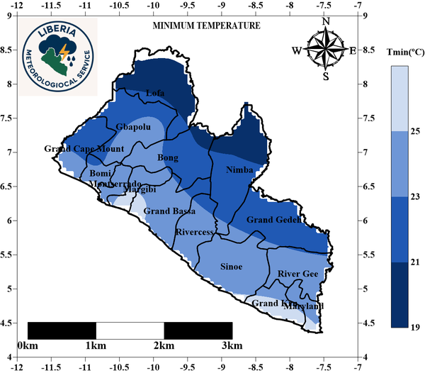 Minimum temperature: Minimum temperature across the country in March 2026 is anticipated to range between 23.0°C and 26.8°C. The highest minimum temperature is anticipated to occur along the coastal region affecting counties such as Maryland, Grand Kru, Sinoe, Rivercess, Grand Bassa, Margibi and Montserrado while the lowest minimum temperature is expected in Lofa and parts of Nimba, Bong and Gbapolu counties.