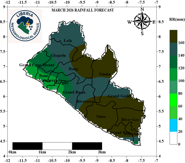 In MARCH 2026, the forecasted cumulative rainfall amount across the counties is anticipated to be between 95.1mm and 241.3mm. Sinoe, River Gee, Grand Kru and parts Maryland, Nimba, Bong and Lofa are expected to record the highest rainfall amount. The western region including Grand Cape Mount, Bomi, Montserrado, Margibi and parts of Grand Bassa and Gbarpolu are expected to receive less rainfall during this period. The rest of the country are expected to experience moderate rainfall during this period.