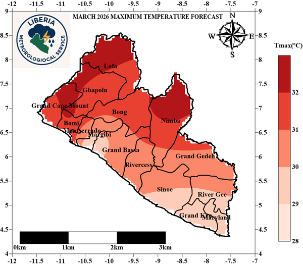 The maximum temperature in March 2026 is anticipated to be between 28.6°C to 32.7°C across the counties. The lowest maximum daytime temperatures are predicted over Maryland, Grand Kru, Sinoe, Margibi and Grand Bassa counties. The highest maximum temperature is expected in the north, west and central regions of the country. However, the extreme maximum temperature is expected to occur in parts of Lofa, Nimba, Gbapolu and Grand Cape Mount counties.