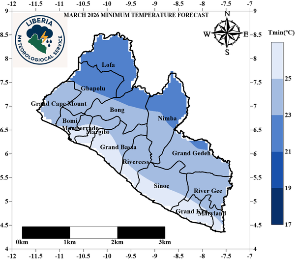 Minimum temperatures across the country in March 2026 is anticipated to range between 23.0°C and 26.8°C. The highest minimum temperature is anticipated to occur along the coastal region affecting counties such as Maryland, Grand Kru, Sinoe, Rivercess, Grand Bassa, Margibi and Montserrado while the lowest minimum temperature is expected in Lofa and parts of Nimba, Bong and Gbapolu counties.